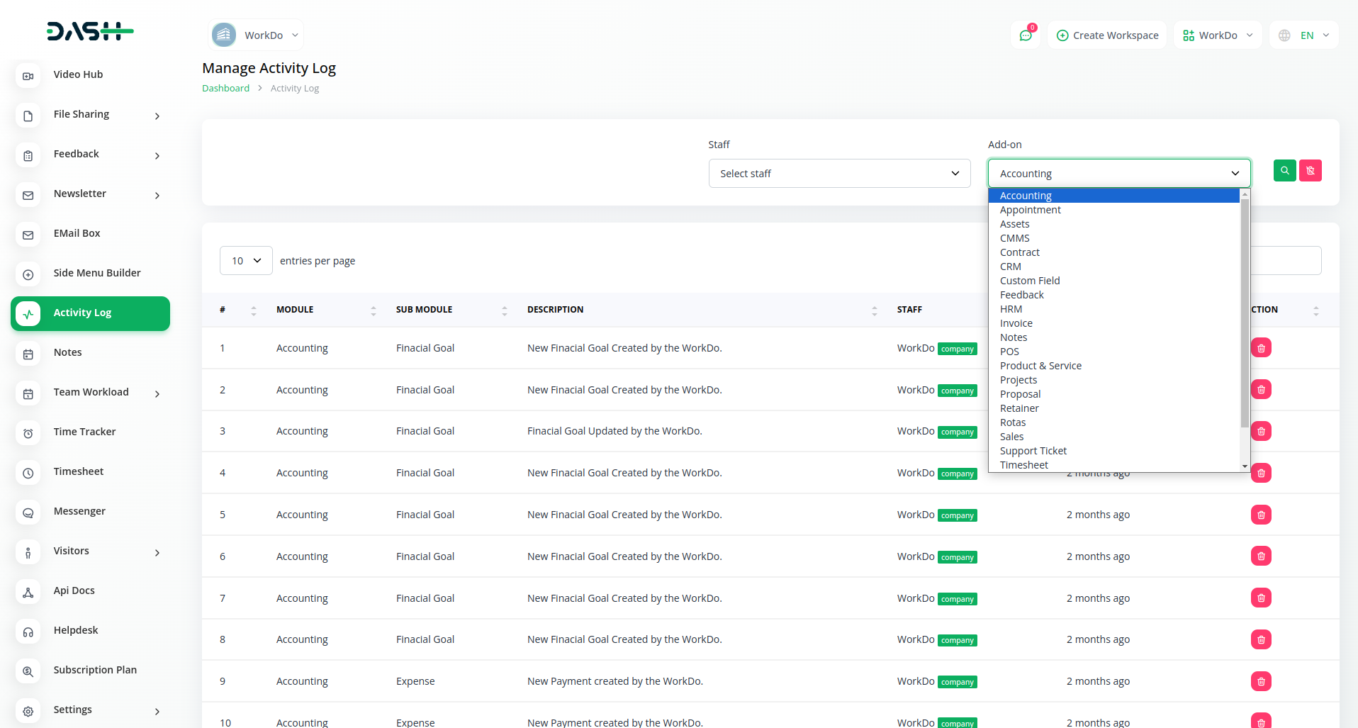 The activity log shows you the activity happening within the modules along with time and according to the appropriate formate. For example, when you create a new object inside any module and edit it, the activity log will show you that activity.