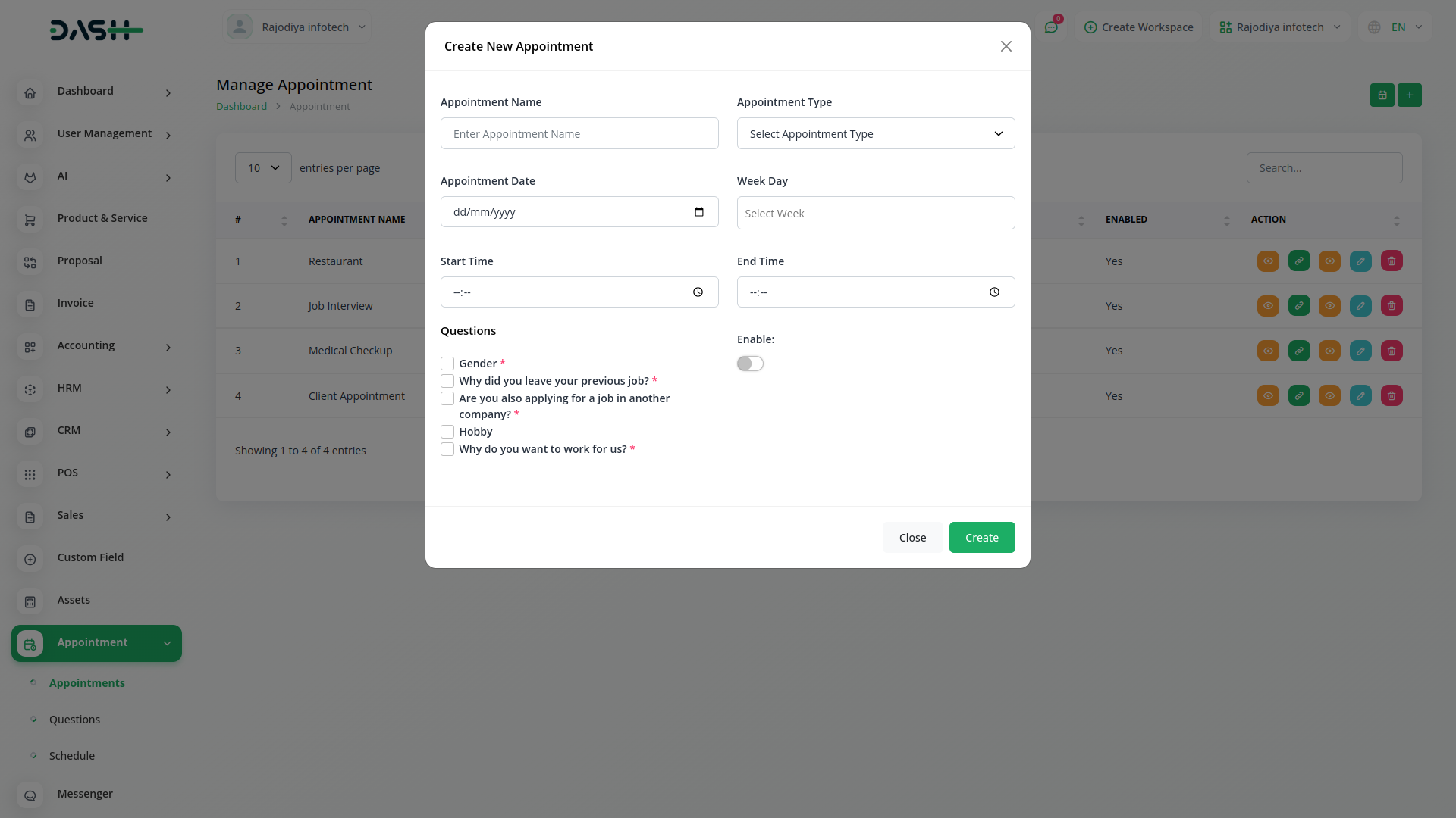 In the appointment section, you can create an appointment. It has a calendar button that displays all appointments and changes color according to the appointment status. It has a copy link button, in which any user can fill out the appointment form.