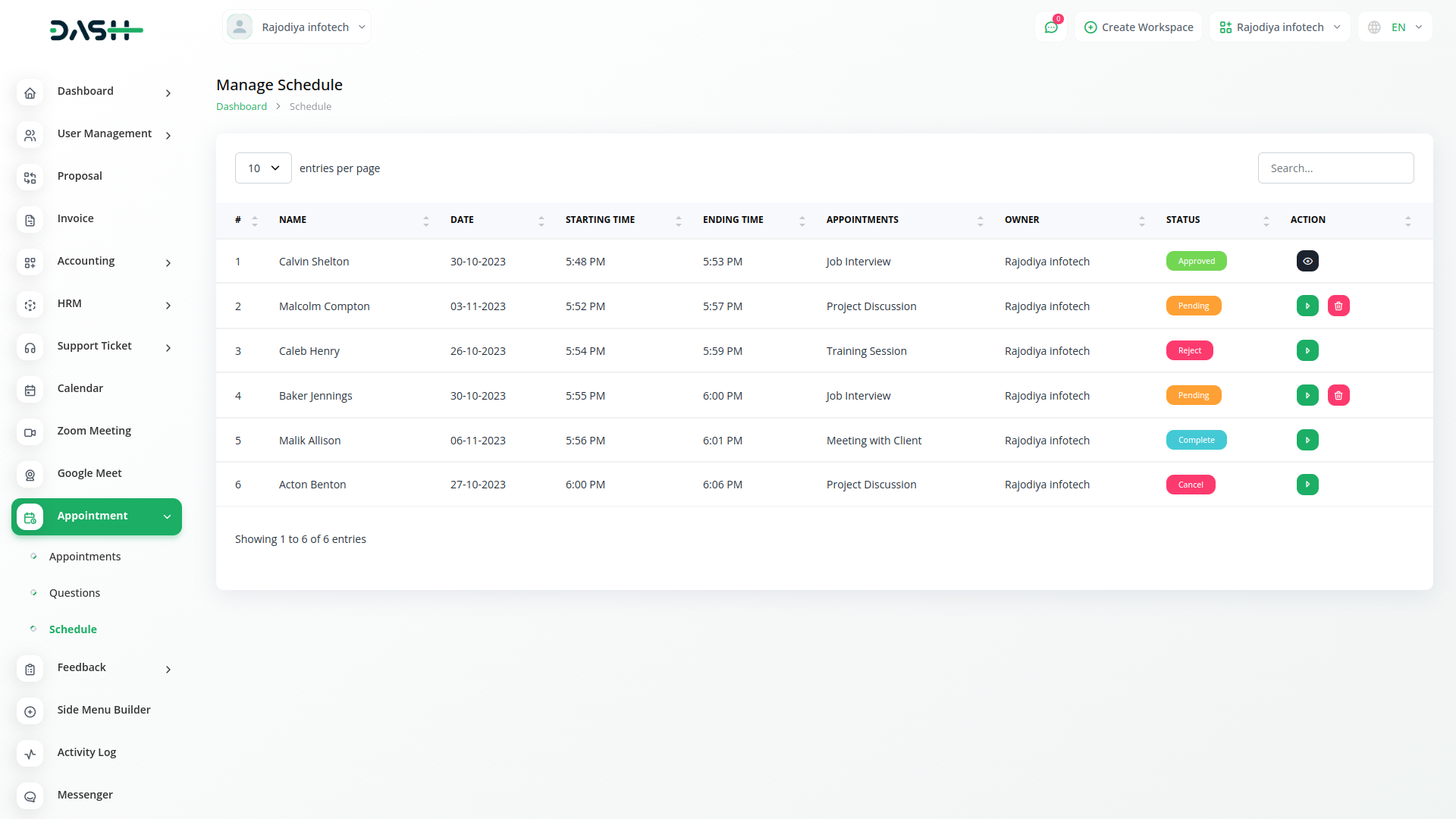 In the schedule section, the details of the filled appointment form are shown. In it, the schedule status action can be changed. It has the option to approve appointments, reject appointments, assign users, complete appointments, and send feedback forms after completion. Here, appointment approval or rejection will be communicated to the appointee through their email when they fill out the form, and a feedback form will also be sent.