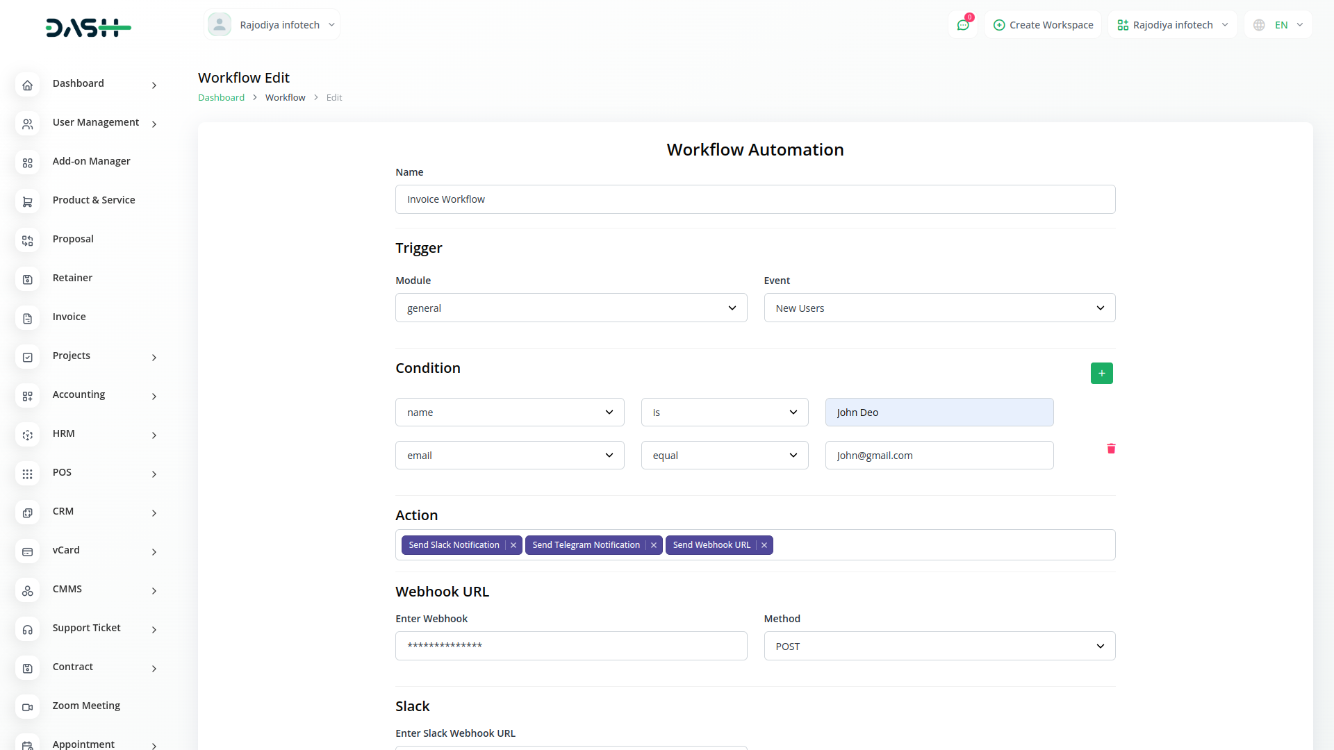 Workflow automation triggers notifications (email, Slack, Telegram, Twitter) for new invoices, user leads, projects. It monitors status and sends personalized alerts. Streamlines communication and updates for efficient processes.